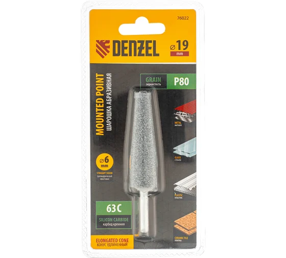 Шарошка абразивная Denzel 76022 с рабочей частью в форме удлиненного конуса 19 х 60 мм, с хвостовиком диаметром 6 мм, — оснастка для дрели, шуруповерта или прямошлифовальной машины (ПШМ). С ее помощью можно удалить заусенцы, снять фаски, очистить поверхность от ржавчины. Шарошка удобна для обработки отверстий и труднодоступных мест. Пригодится в ремонтной мастерской, автосервисе, будет полезна при выполнении отделочных