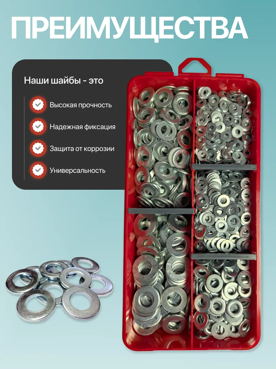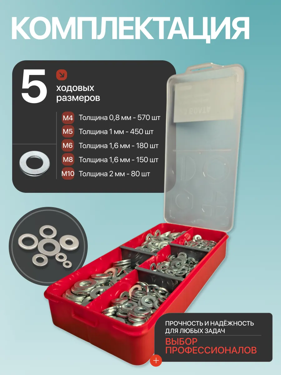 Отличный комплект.Шайбы чистые, без заусенцев, покрытие ровное. Главный плюс-это органайзер: защелки плотные, размеры не перемешиваются при переноске.