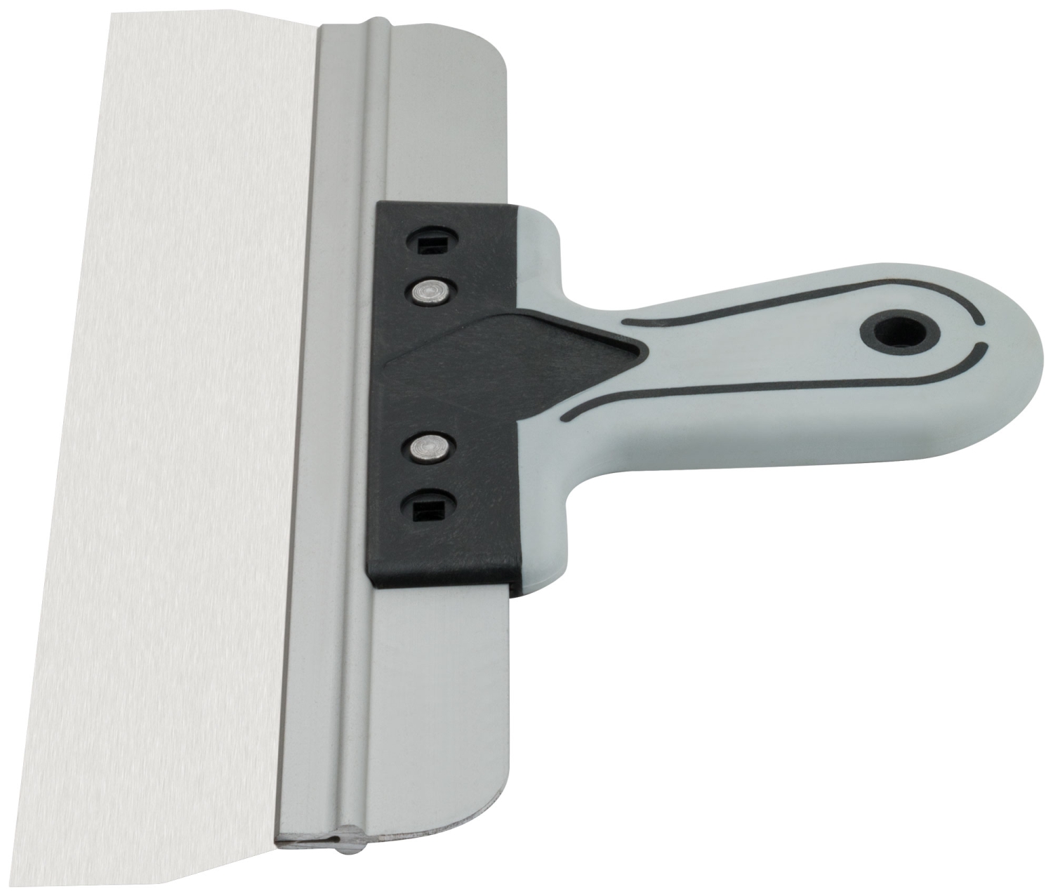 Профи. Для работы на поверхностях большой площади. Материал: лезвие из нержавеющей стали, алюминиевое ребро жесткости, пластиковая прорезиненная ручка.