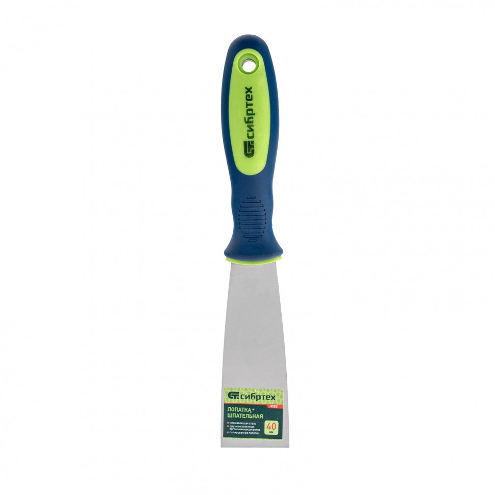 Шпательная лопатка из нержавеющей стали Сибртех 85521 шириной 40 мм, с двухкомпонентной рукояткой, облегчает проведение ремонтно-отделочных работ. Позволяет наносить и разравнивать строительные смеси, шпаклевать швы, заполнять трещины, удалять старые обои и выполнять работы в труднодоступных местах.
