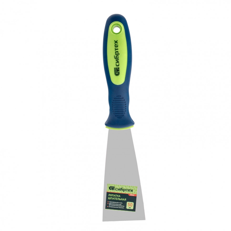 Шпательная лопатка из нержавеющей стали Сибртех 85522 шириной 50 мм, с двухкомпонентной рукояткой, облегчает проведение ремонтно-отделочных работ. Позволяет наносить и разравнивать строительные смеси, шпаклевать швы, заполнять трещины, удалять старые обои и выполнять работы в труднодоступных местах.