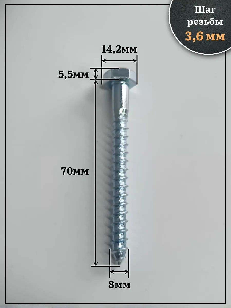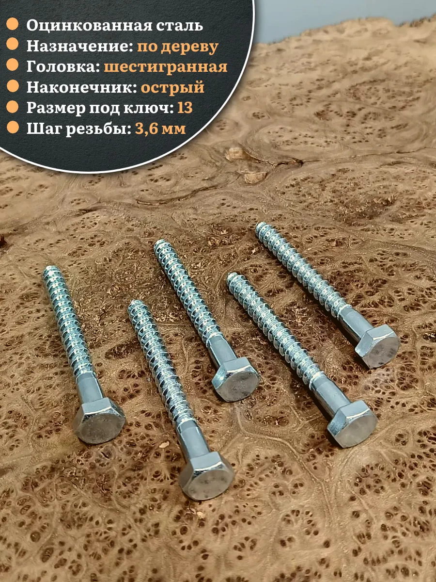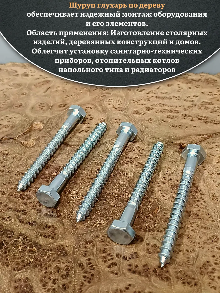 Крепёжное изделие в виде стержня с шестигранной или квадратной головкой под ключ и специальной наружной резьбой, образующей внутреннюю резьбу в отверстии соединяемого предмета.Саморез делается из оцинкованной стали. Такой крепеж обеспечивает надежный монтаж оборудования и его элементов. В состав изделия входит стержень, имеющий неполную резьбу, и шестигранная головка «под ключ». Область применения: Изготовление столярных изделий, деревянных конструкций и домов, установку санитарно-технических приборов, отопительных котлов напольного типа и радиаторов облегчит саморез типа «глухарь», соответствующий DIN 571. Чтобы смонтировать крепеж в строительную конструкцию из кирпича, природного камня или бетона, саморез нужно дополнительно укомплектовать разжимной втулкой из полимерного материала с соответствующими размерами. Изделие можно устанавливать в горизонтальных или вертикальных поверхностях.