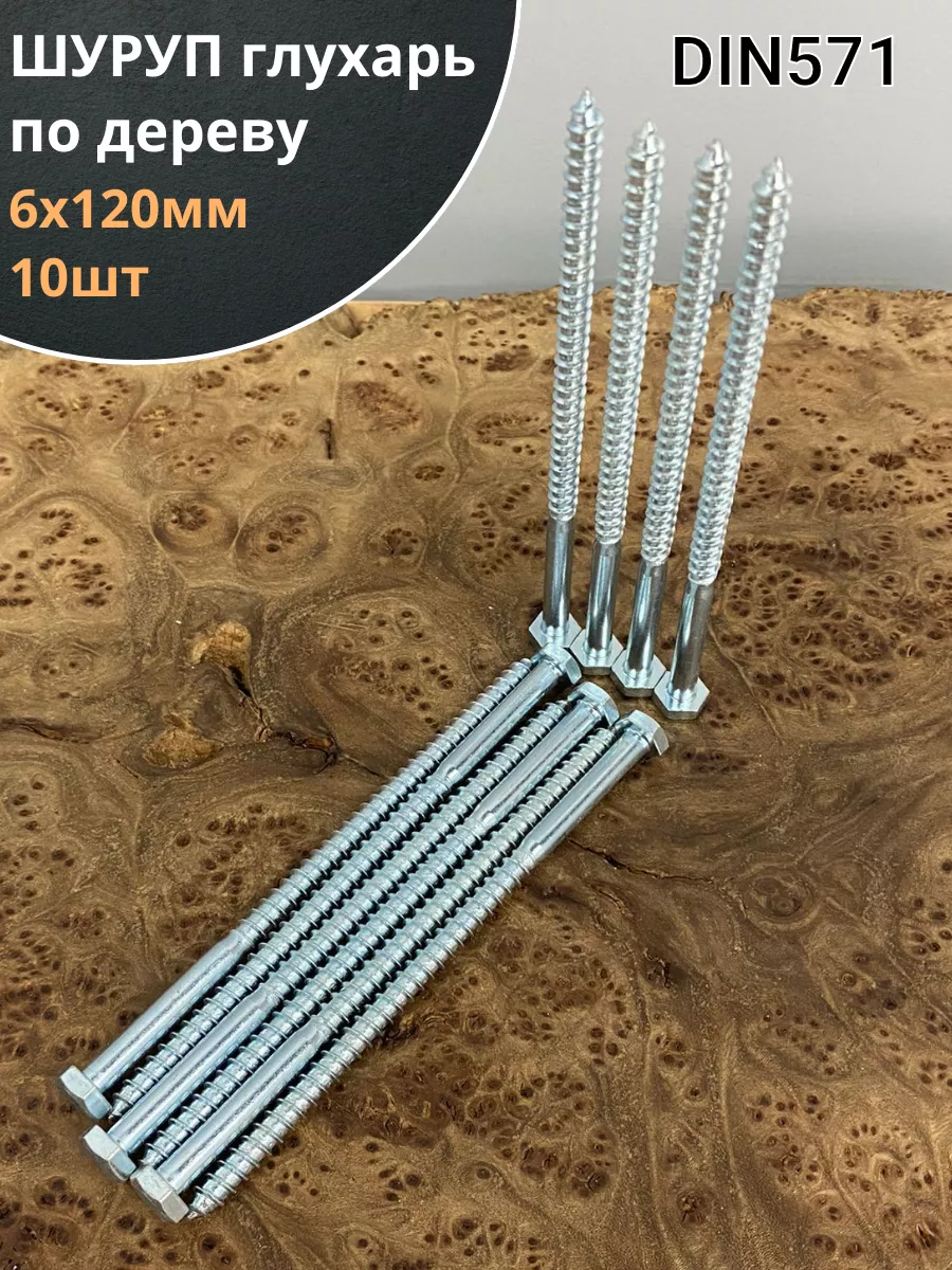 Крепёжное изделие в виде стержня с шестигранной или квадратной головкой под ключ и специальной наружной резьбой, образующей внутреннюю резьбу в отверстии соединяемого предмета. Саморез делается из оцинкованной стали. Такой крепеж обеспечивает надежный монтаж оборудования и его элементов. В состав изделия входит стержень, имеющий неполную резьбу, и шестигранная головка «под ключ». Область применения: Изготовление столярных изделий, деревянных конструкций и домов, установку санитарно-технических приборов, отопительных котлов напольного типа и радиаторов облегчит саморез типа «глухарь», соответствующий DIN 571. Чтобы смонтировать крепеж в строительную конструкцию из кирпича, природного камня или бетона, саморез нужно дополнительно укомплектовать разжимной втулкой из полимерного материала с соответствующими размерами. Изделие можно устанавливать в горизонтальных или вертикальных поверхностях.