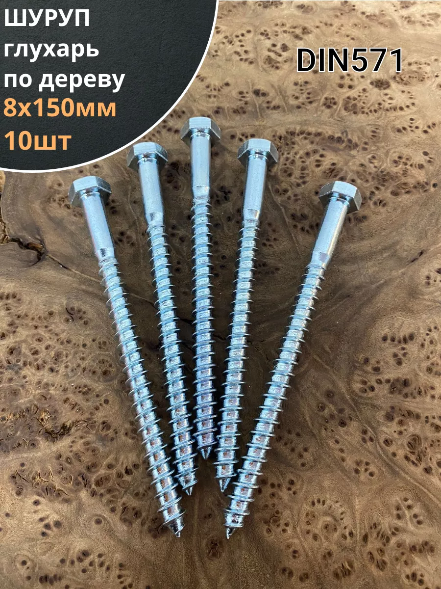 Крепёжное изделие в виде стержня с шестигранной или квадратной головкой под ключ и специальной наружной резьбой, образующей внутреннюю резьбу в отверстии соединяемого предмета. Саморез делается из оцинкованной стали. Такой крепеж обеспечивает надежный монтаж оборудования и его элементов. В состав изделия входит стержень, имеющий неполную резьбу, и шестигранная головка «под ключ». Область применения: Изготовление столярных изделий, деревянных конструкций и домов, установку санитарно-технических приборов, отопительных котлов напольного типа и радиаторов облегчит саморез типа «глухарь», соответствующий DIN 571. Чтобы смонтировать крепеж в строительную конструкцию из кирпича, природного камня или бетона, саморез нужно дополнительно укомплектовать разжимной втулкой из полимерного материала с соответствующими размерами. Изделие можно устанавливать в горизонтальных или вертикальных поверхностях.