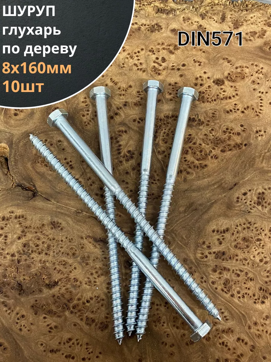 Крепёжное изделие в виде стержня с шестигранной или квадратной головкой под ключ и специальной наружной резьбой, образующей внутреннюю резьбу в отверстии соединяемого предмета. Саморез делается из оцинкованной стали. Такой крепеж обеспечивает надежный монтаж оборудования и его элементов. В состав изделия входит стержень, имеющий неполную резьбу, и шестигранная головка «под ключ». Область применения: Изготовление столярных изделий, деревянных конструкций и домов, установку санитарно-технических приборов, отопительных котлов напольного типа и радиаторов облегчит саморез типа «глухарь», соответствующий DIN 571. Чтобы смонтировать крепеж в строительную конструкцию из кирпича, природного камня или бетона, саморез нужно дополнительно укомплектовать разжимной втулкой из полимерного материала с соответствующими размерами. Изделие можно устанавливать в горизонтальных или вертикальных поверхностях.