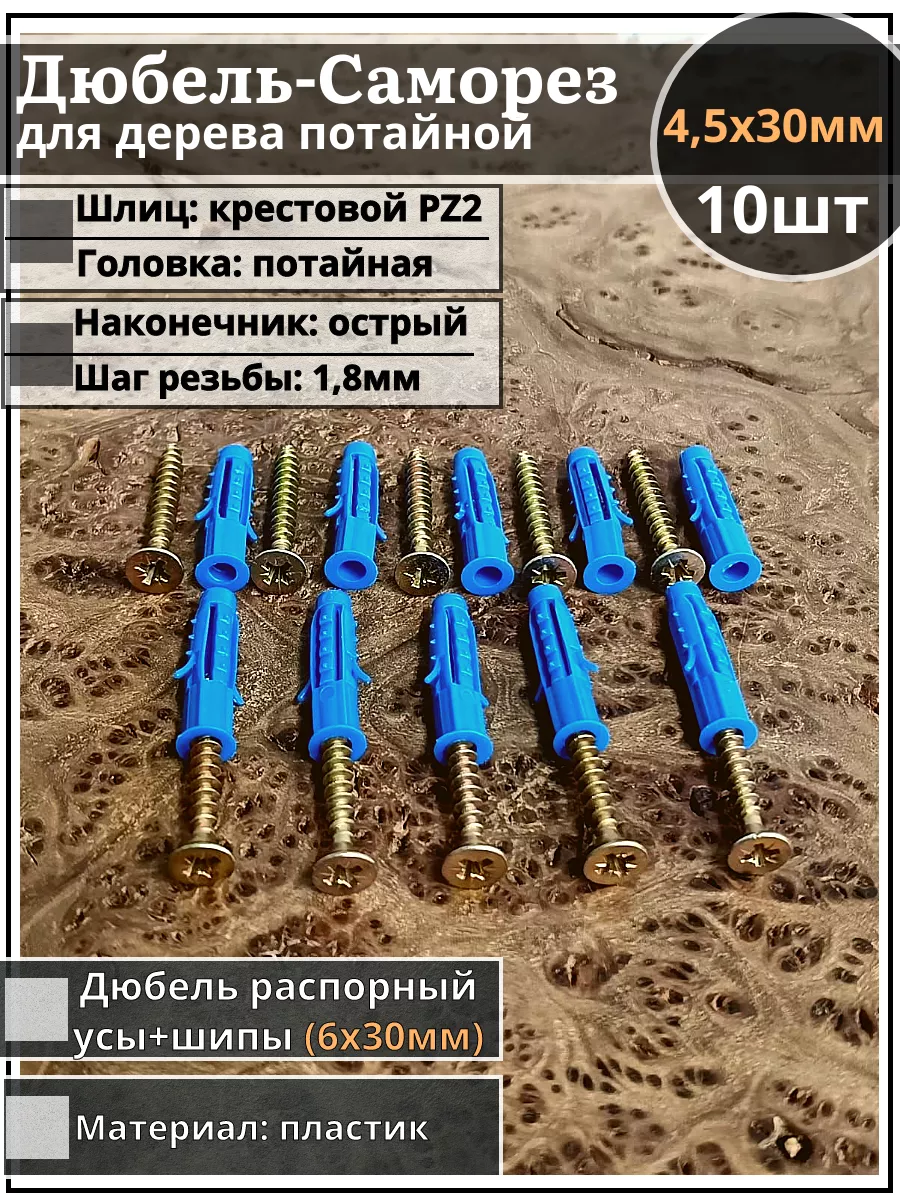 Шуруп саморез 4,5х30 мм ЖЦ с дюбелем 6х30, 10 шт.