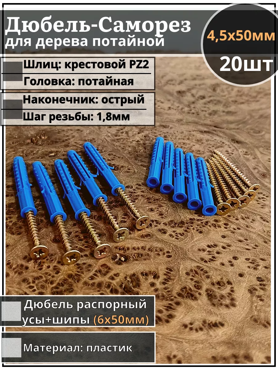 | Шуруп саморез 4,5х50 мм ЖЦ с дюбелем 6х50, 20 шт. | AB7104505060N0Ф/B23300605006000ф20 | 1 шт. |