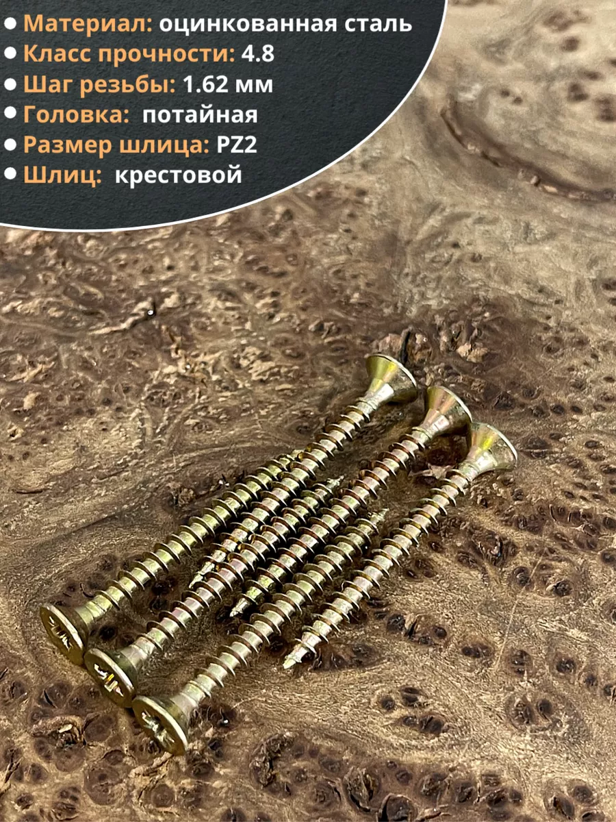 Шуруп — это металлический крепеж, представляющий собой стержень с головкой и острым наконечником. Универсальность проявляется в конструкции и области применения. Назначение шурупа — стягивать, скреплять между собой элементы: деревянных, древесностружечных и гипсокартонных плит, из тонкого листового металла. Крепежное изделие изготовлено из оцинкованной стали с дополнительной пассивацией. Саморез имеет желтый цвет. Его классическая конструкция включает заостренный цилиндрический стержень с винтовой нарезкой по всей длине, а также потайную головку с крестообразным шлицем PZ. Этот элемент служит для передачи крутящего момента от инструмента – отвертки, шуруповерта при закручивании или выкручивании крепежа.
