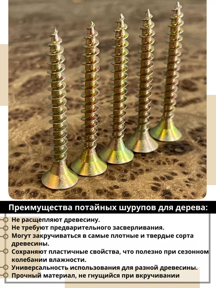 Шуруп саморез потайной для дерева 6х45 мм, желтый цинк, 1 кг. представляет собой стержень с головкой и острым наконечником. Универсальность проявляется в конструкции и области применения. Назначение шурупа — стягивать, скреплять между собой элементы: деревянных, древесностружечных и гипсокартонных плит, из тонкого листового металла. Он аккуратно и быстро вкручивается в материал без предварительного сверления, обеспечивая надежное соединение с основой. Крепежное изделие изготовлено из оцинкованной стали с дополнительной пассивацией. Саморез имеет желтый цвет. Его классическая конструкция включает заостренный цилиндрический стержень с винтовой нарезкой по всей длине, а также потайную головку с крестообразным шлицем PZ. Этот элемент служит для передачи крутящего момента от инструмента – отвертки, шуруповерта при закручивании или выкручивании крепежа.