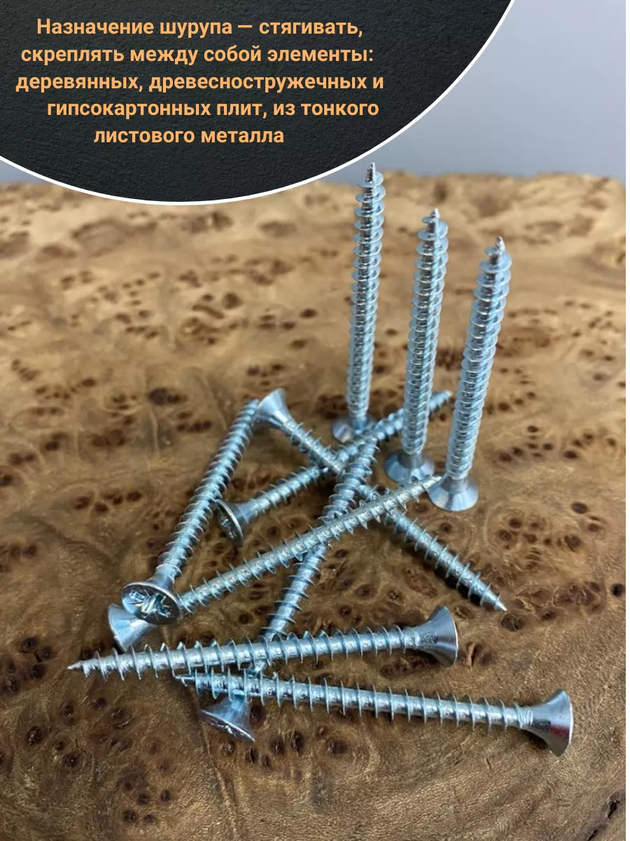 Шуруп — это металлический крепеж, представляющий собой стержень с головкой и острым наконечником. Универсальность проявляется в конструкции и области применения. Назначение шурупа — стягивать, скреплять между собой элементы: деревянных, древесностружечных и гипсокартонных плит, из тонкого листового металла.