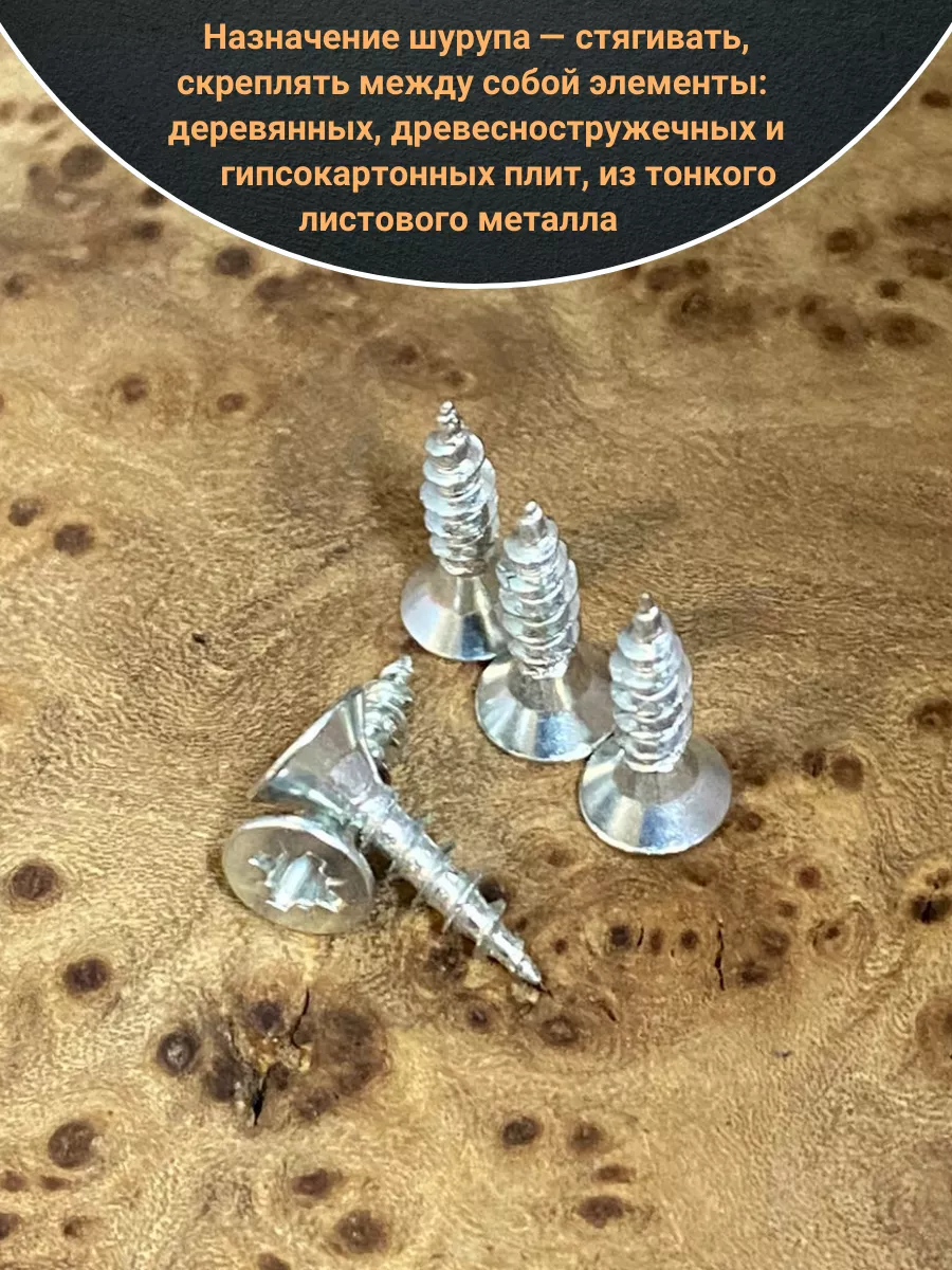 Шуруп — это металлический крепеж, представляющий собой стержень с головкой и острым наконечником. Универсальность проявляется в конструкции и области применения. Назначение шурупа — стягивать, скреплять между собой элементы: деревянных, древесностружечных и гипсокартонных плит, из тонкого листового металла.