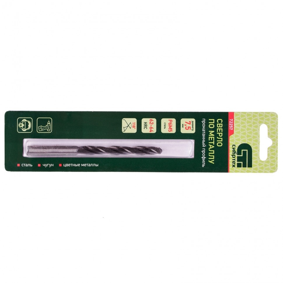 Сверло по металлу Сибртех 72257 из стали P6M5 имеет угол заточки 118 градусов и позволяет получать отверстия диаметром 7,5 мм в черных и тяжелых металлах, в том числе стали, чугуне и твердой бронзе. Сверло отличается наиболее выгодной стоимостью по сравнению с другими моделями из стали P6M5. Используется для монтажно-сборочных работ, будет полезно в быту. Сверло изготовлено из быстрорежущей стали, легированной вольфрамом и молибденом, поэтому устойчиво к динамическим нагрузкам и перегреву.