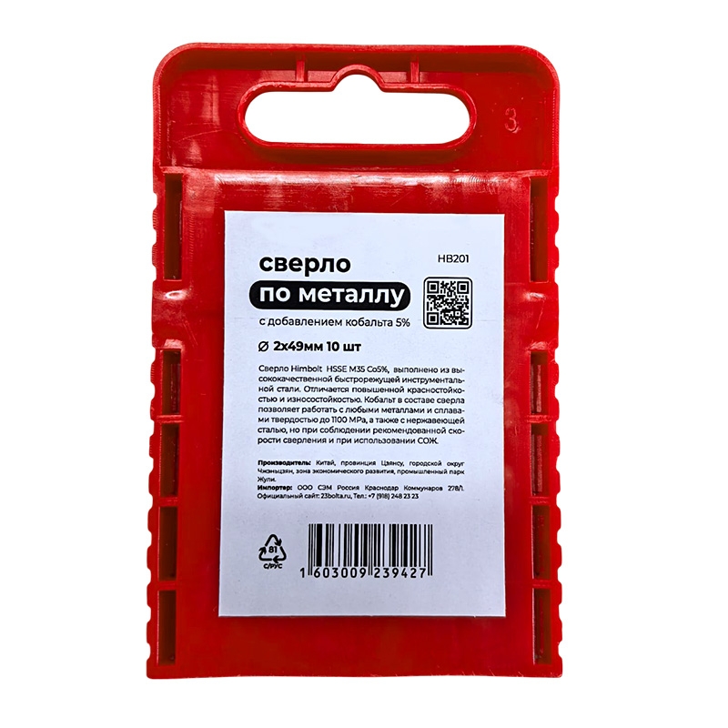 Сверло по металлу с кобальтом 5% P6M5K5 2,0 мм HIMBOLT 10 шт.пласт.бокс выполнено из высококачественной быстрорежущей инструментальной стали. Отличается повышенной красностойкостью и износостокойстью. Кобальт в составе сверла позволяет работать с любыми металлами и сплавами твердостью до 1100 МРА, а также с нержавеющей сталью, но при соблюдении рекомендованной скорости сверления и при использовании СОЖ.