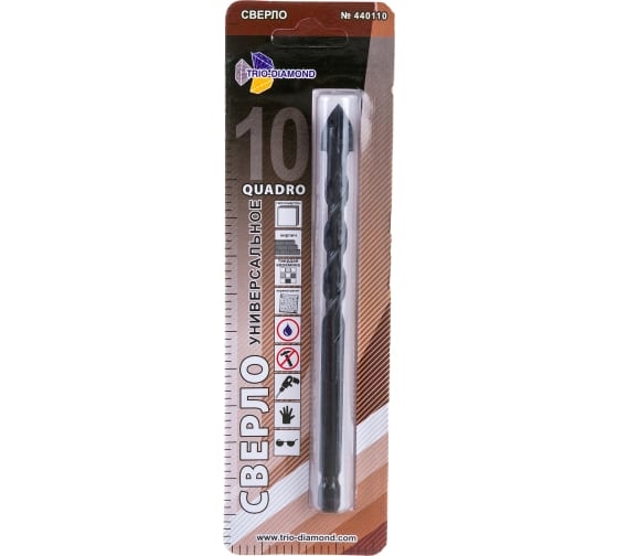 Сверло универсальное квадро TRIO-DIAMOND 440110 служит для работы с шуруповертом, дрелью в безударном режиме. Подходит для сверления керамогранита, твердой керамики, кирпича, гипсокартона. Сверление необходимо проводить с охлаждением сверла и места сверления водой. Количество режущих граней - 4 шт.