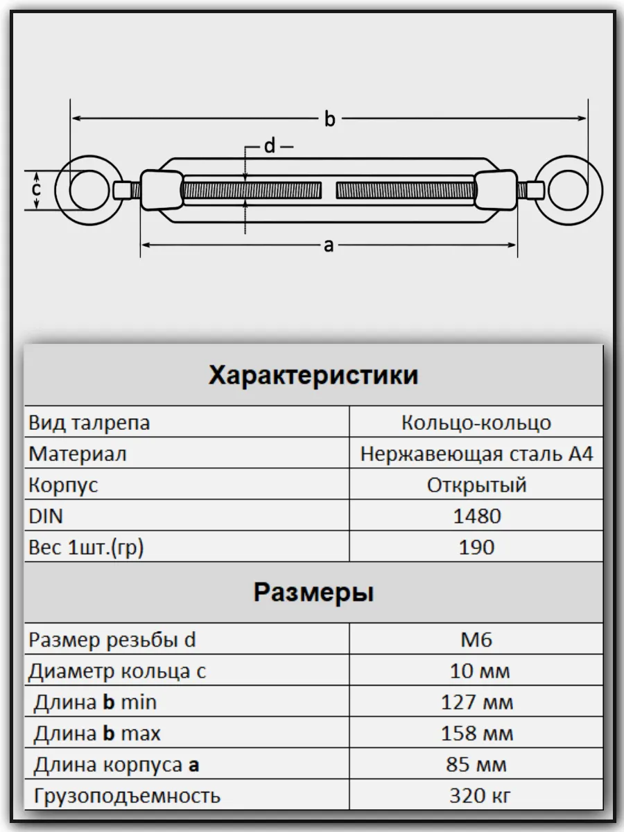 | Талреп кольцо-кольцо нержавеющий А4 М6 DIN1480, 6 шт. | A4BJ50600091A07ф6 | 1 шт. |
