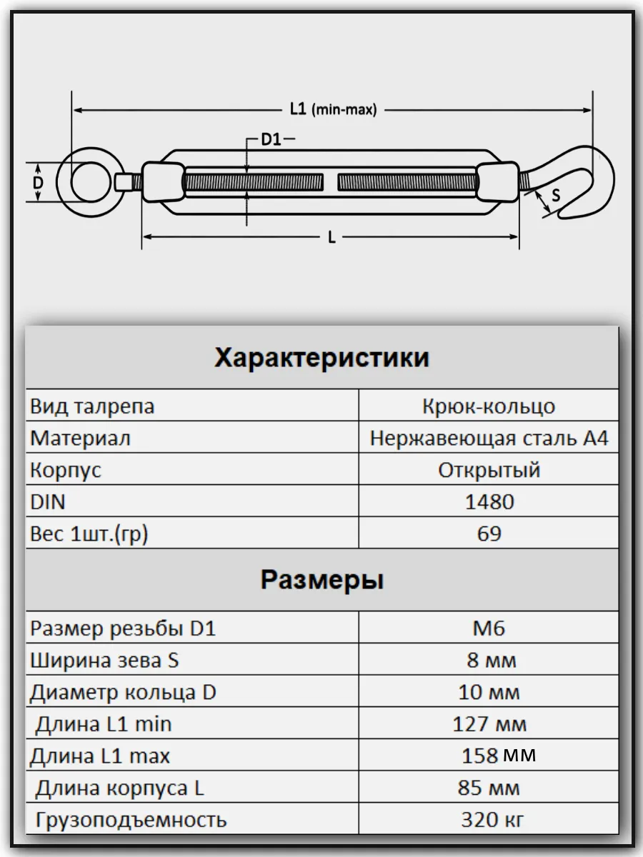 Талреп крюк-кольцо нержавеющий А4 М6 DIN1480, 1 шт.