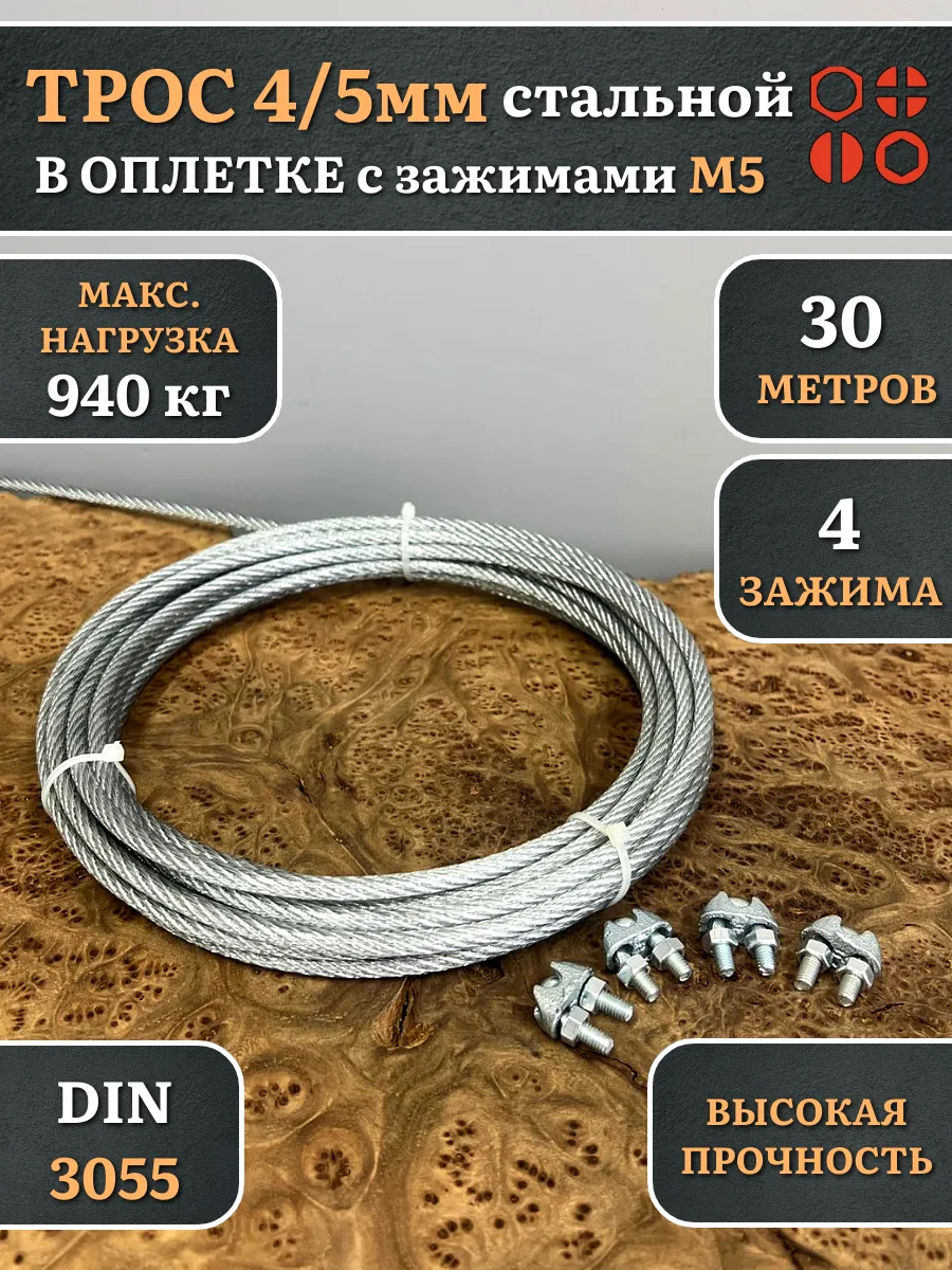 Трос стальной 4/5 с зажимами (4 шт.) оцинкованный в оплетке, 30 м.