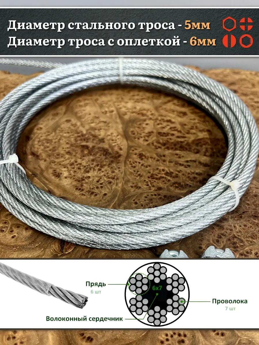 | Трос стальной 5/6 с зажимами (4 шт.) оцинкованный в оплетке, 10 метров | B6H100506032007/B61100600031007-10м | 1 шт. |
