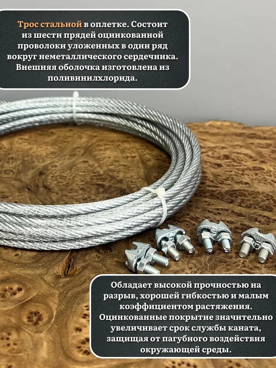 Трос стальной 5/6 с зажимами (4 шт.) ОЦ в оплетке