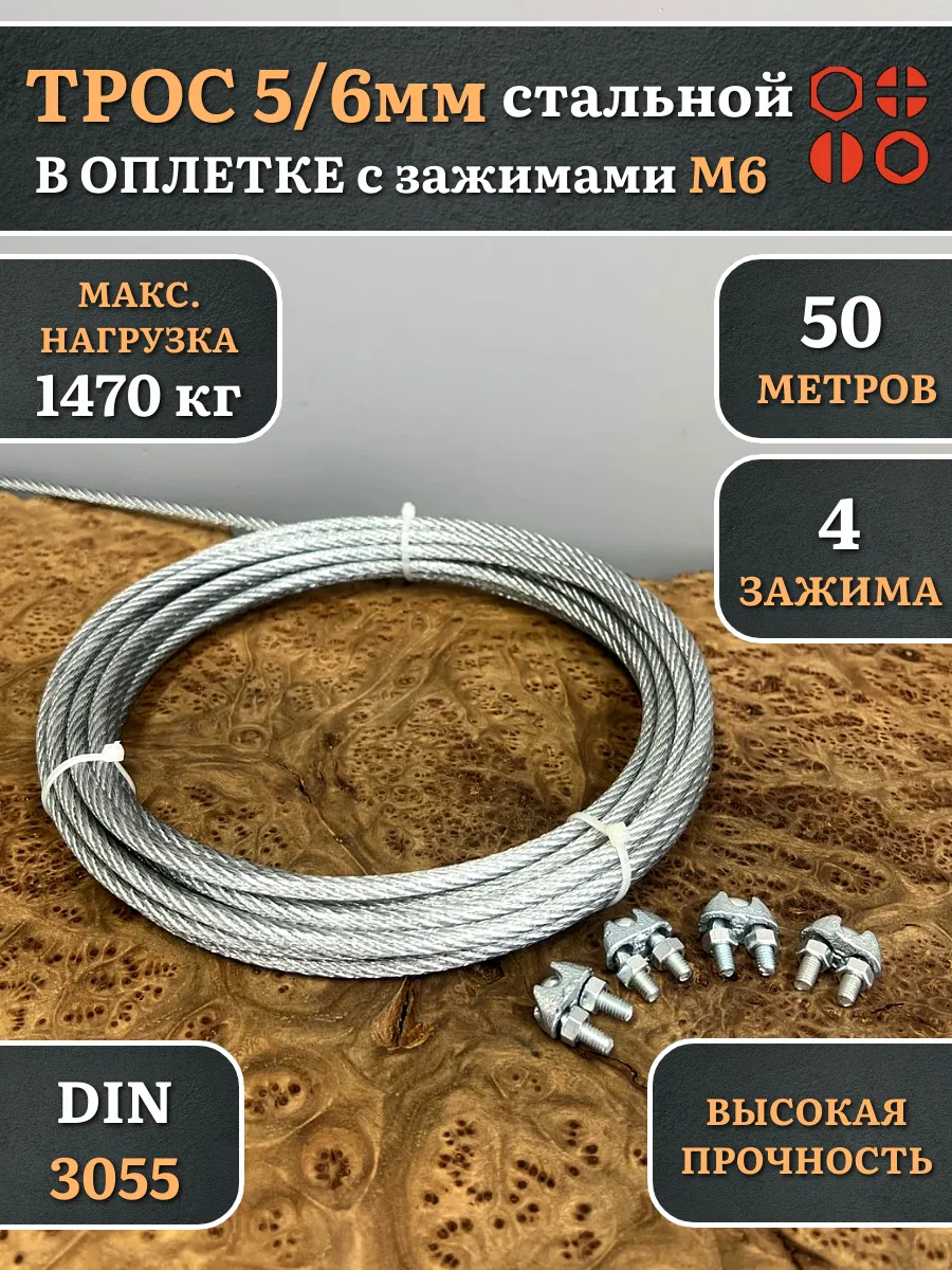| Трос стальной 5/6 с зажимами (4 шт.) ОЦ в оплетке, 50 метров | B6H100506032007/B61100600031007-50м | 1 шт. |