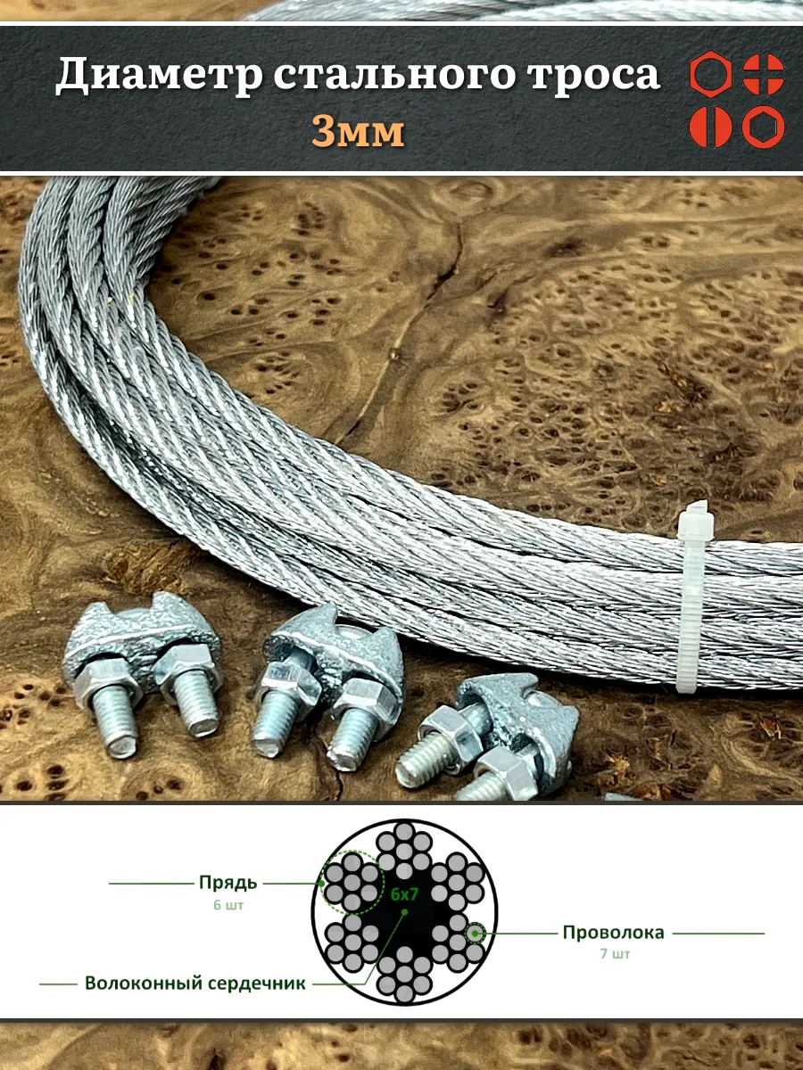 | Трос стальной d3 с зажимами (4 шт.) оцинкованный без оплетки, 10 метров | B6H000300034007/B61100300033007-10м | 1 шт. |