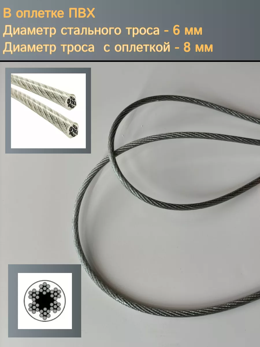 Трос стальной для растяжки 6/8мм 100м в оплетке ПВХ DIN305