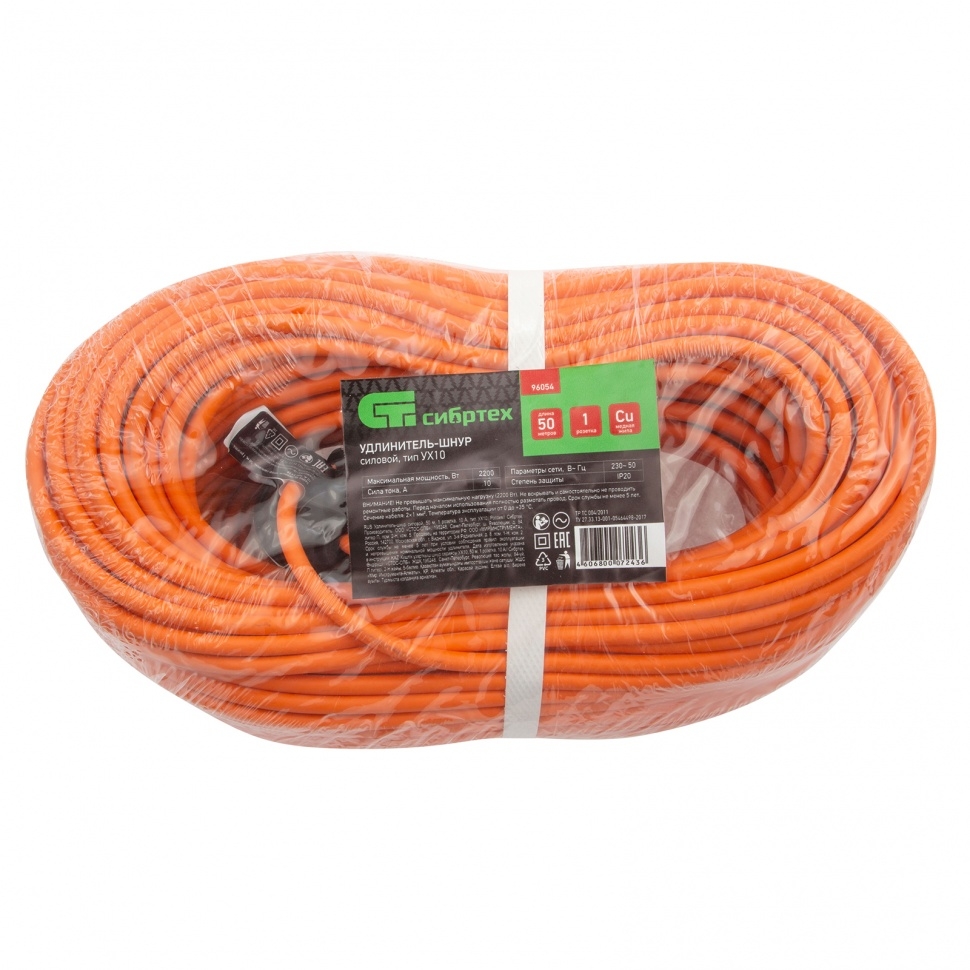 Удлинитель-шнур силовой, 50 м, 10А, 1 розетка, тип УХ10 Сибртех