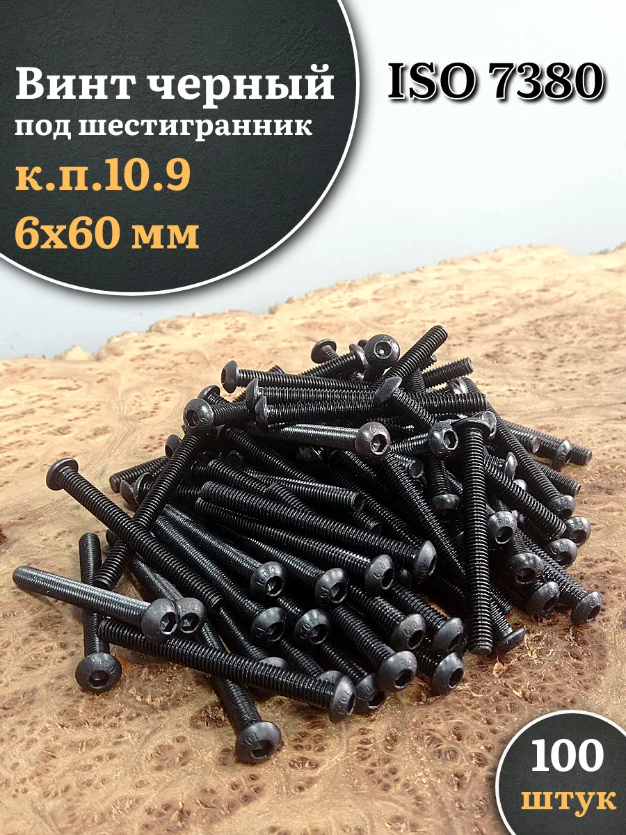 Винт чёрный М6х60 ISO 7380 под шестигранник к.п.10.9, 100 шт.