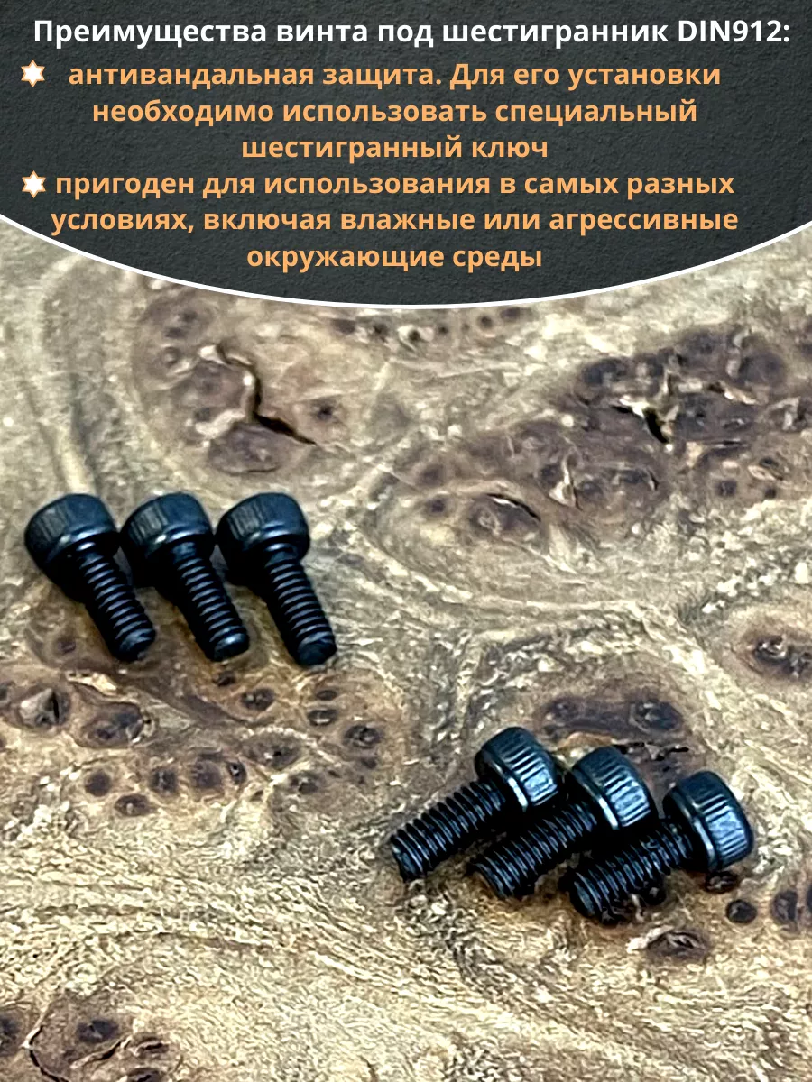 Винт имеет высокую цилиндрическую головку, предназначен для установки его с углублением в отверстие. Закручивается винт при помощи ключа-шестигранника. Высокопрочный винт DIN 912 обеспечивает надежное скрепление узлов и деталей в монтажных и других видах работ. Он имеет головку цилиндрической формы с углублением под соответствующий шестигранный ключ.