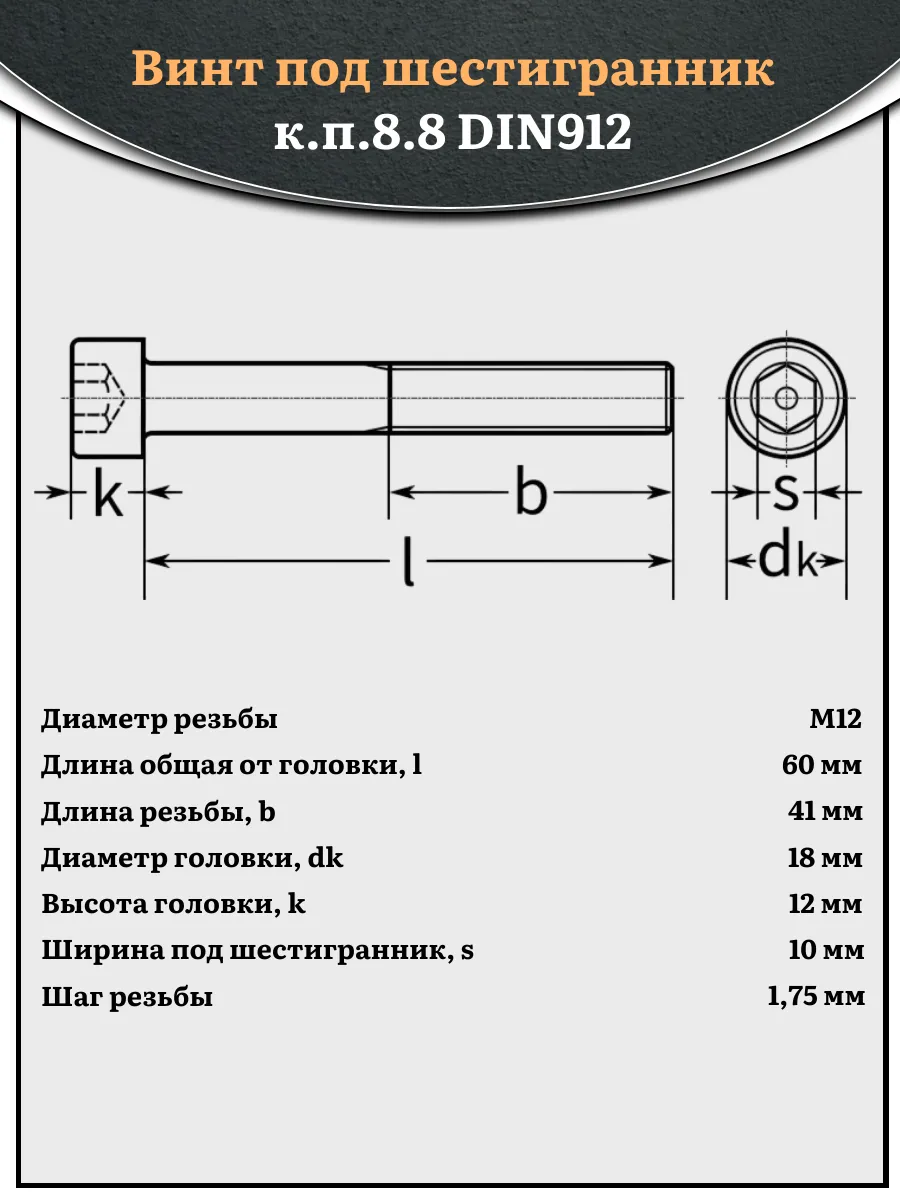 Винт под шестигранник НР 12х60 мм ОЦ к.п.8.8 DIN912, 10 шт.