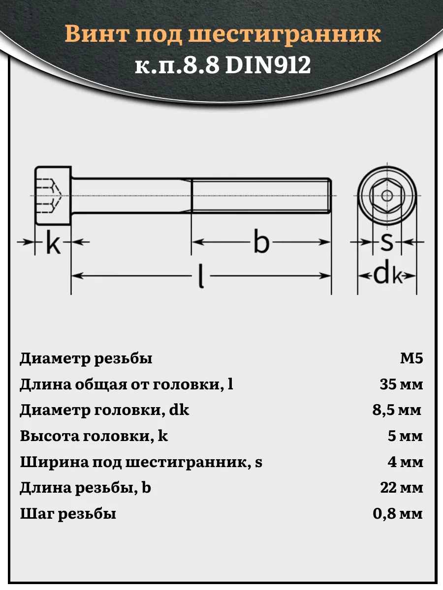 Винт под шестигранник НР 5х35 мм ОЦ к.п.8.8 DIN912, 10 шт.
