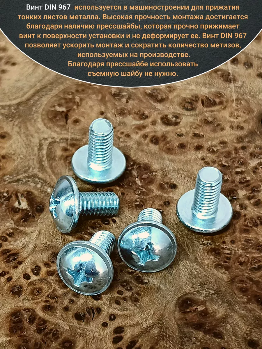 Винт мебельный с полукруглой головкой и прессшайбой, применяется при строительных работах, в машиностроении. Используется для монтажа из металла, пластика и древесины твердых пород. Монтаж производится в заранее подготовленное отверстие с применением гайки соответствующего диаметра, или применятся для вкручивания в различные резьбовые отверстия при монтаже. Винт мебельный DIN 967 — это универсальное крепежное изделие в виде стержня с наружной резьбой, выполненной по всей длинне. Головка крепежа в виде полусферы с широкими полями, на головке имеются пазы под крестовую отвертку. При проведении монтажа можно использовать как PZ, так и SL отвертки или насадки, что делает крепеж универсальным.