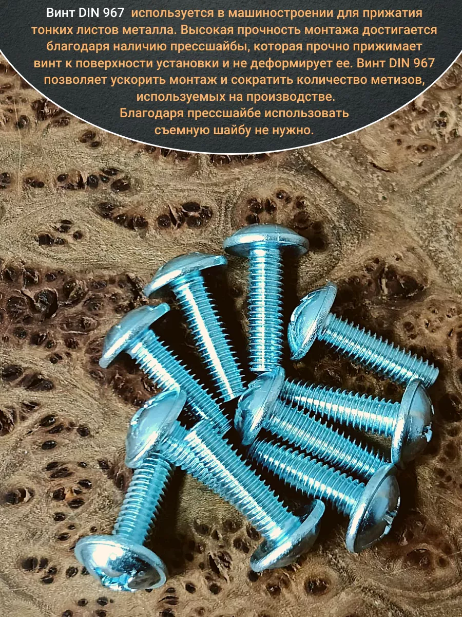 Винт мебельный с полукруглой головкой и прессшайбой, применяется при строительных работах, в машиностроении. Используется для монтажа из металла, пластика и древесины твердых пород. Монтаж производится в заранее подготовленное отверстие с применением гайки соответствующего диаметра, или применятся для вкручивания в различные резьбовые отверстия при монтаже. Винт мебельный DIN 967 — это универсальное крепежное изделие в виде стержня с наружной резьбой, выполненной по всей длинне. Головка крепежа в виде полусферы с широкими полями, на головке имеются пазы под крестовую отвертку. При проведении монтажа можно использовать как PZ, так и SL отвертки или насадки, что делает крепеж универсальным.
