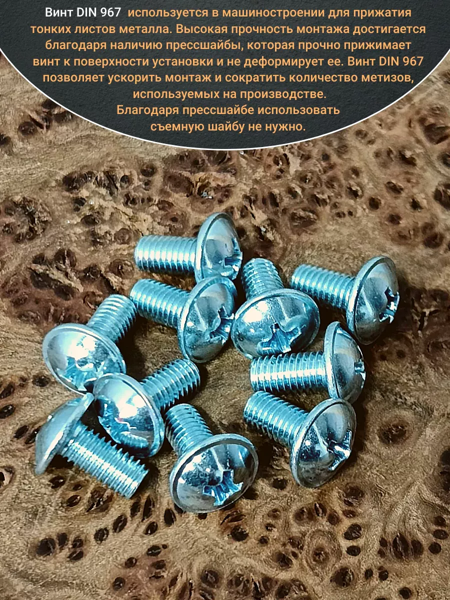 Винт мебельный с полукруглой головкой и прессшайбой, применяется при строительных работах, в машиностроении. Используется для монтажа из металла, пластика и древесины твердых пород. Монтаж производится в заранее подготовленное отверстие с применением гайки соответствующего диаметра, или применятся для вкручивания в различные резьбовые отверстия при монтаже. Винт мебельный DIN 967 — это универсальное крепежное изделие в виде стержня с наружной резьбой, выполненной по всей длинне. Головка крепежа в виде полусферы с широкими полями, на головке имеются пазы под крестовую отвертку. При проведении монтажа можно использовать как PZ, так и SL отвертки или насадки, что делает крепеж универсальным.