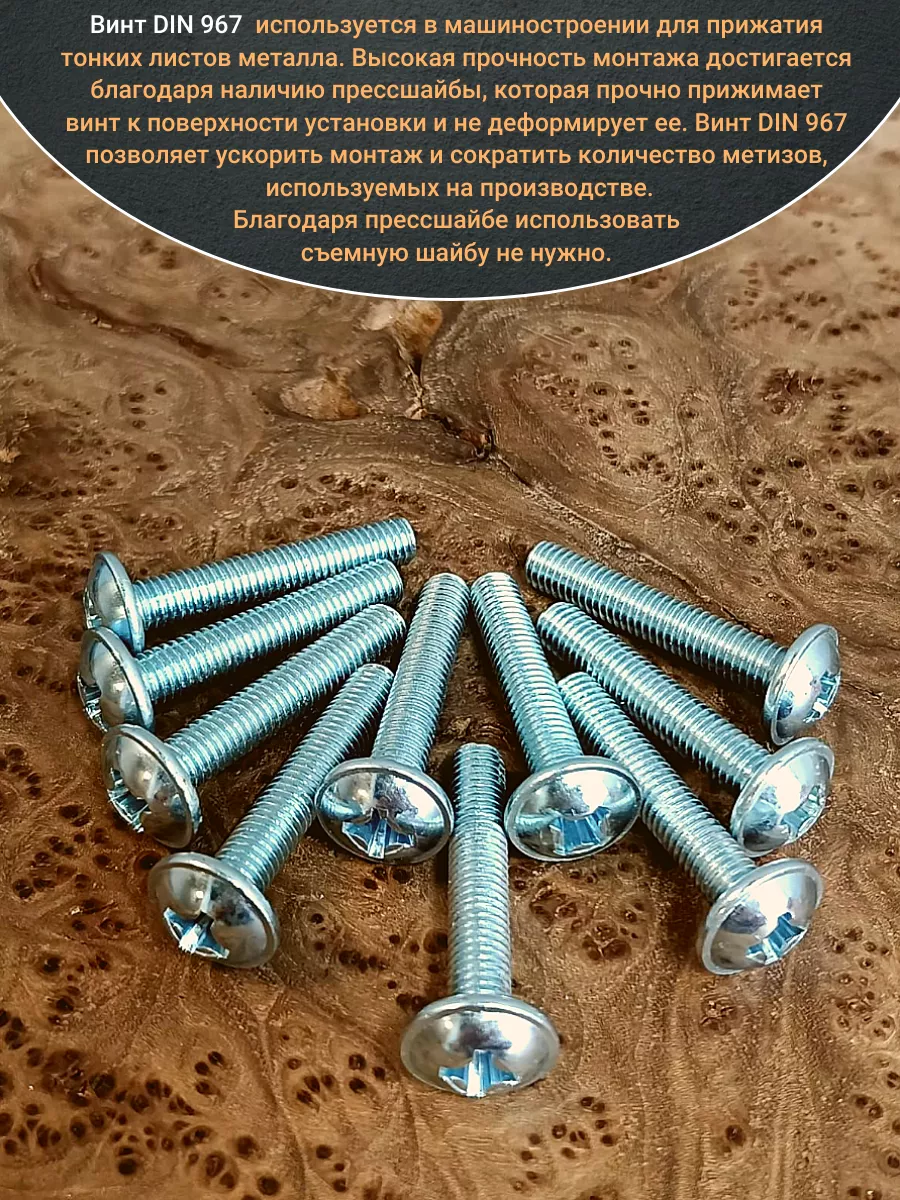 Винт мебельный DIN 967 — это универсальное крепежное изделие в виде стержня с наружной резьбой, выполненной по всей длиннее. Головка крепежа в виде полусферы с широкими полями, на головки имеются пазы под крестовую отвертку. При проведении монтажа можно использовать как PZ, так и SL отвертки или насадки, что делает крепеж универсальным.