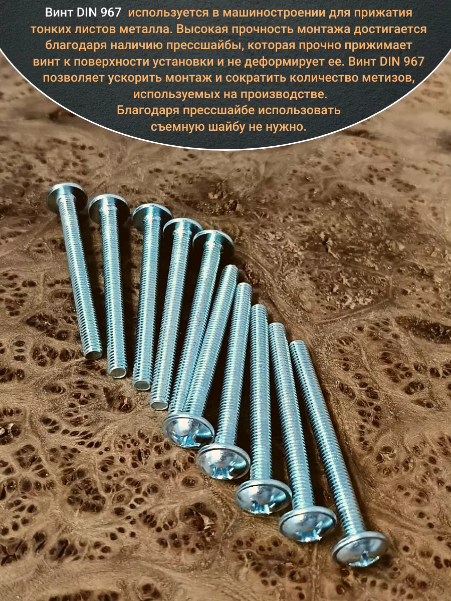 Винт мебельный с полукруглой головкой и прессшайбой, применяется при строительных работах, в машиностроении. Используется для монтажа из металла, пластика и древесины твердых пород. Монтаж производится в заранее подготовленное отверстие с применением гайки соответствующего диаметра, или применятся для вкручивания в различные резьбовые отверстия при монтаже. Винт мебельный DIN 967 — это универсальное крепежное изделие в виде стержня с наружной резьбой, выполненной по всей длинне. Головка крепежа в виде полусферы с широкими полями, на головке имеются пазы под крестовую отвертку. При проведении монтажа можно использовать как PZ, так и SL отвертки или насадки, что делает крепеж универсальным.