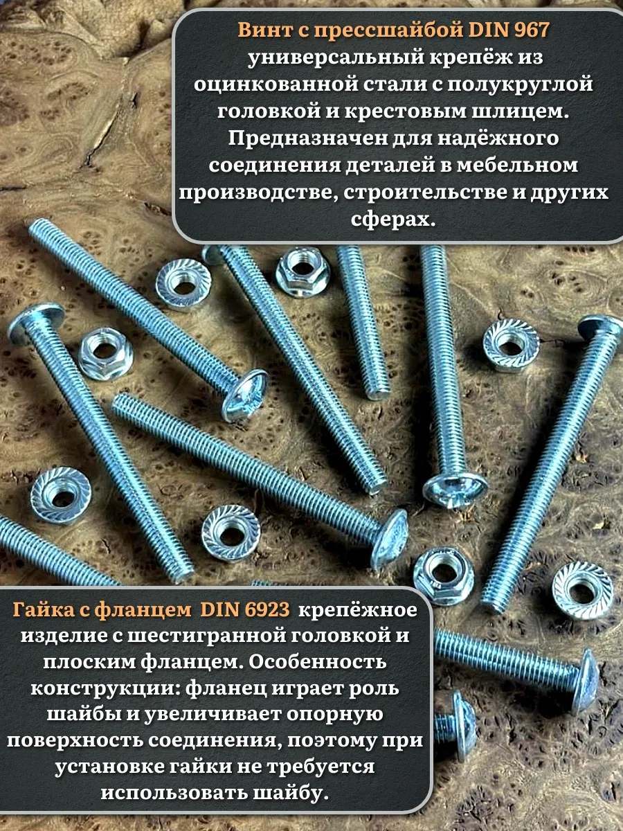 Винт мебельный с полукруглой головкой и прессшайбой, применяется при строительных работах, в машиностроении. Используется для монтажа из металла, пластика и древесины твердых пород. Монтаж производится в заранее подготовленное отверстие с применением гайки соответствующего диаметра, или применятся для вкручивания в различные резьбовые отверстия при монтаже. Винт мебельный DIN 967 — это универсальное крепежное изделие в виде стержня с наружной резьбой, выполненной по всей длинне. Головка крепежа в виде полусферы с широкими полями, на головке имеются пазы под крестовую отвертку. При проведении монтажа можно использовать как PZ, так и SL отвертки или насадки, что делает крепеж универсальным.