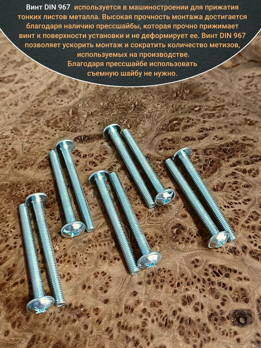 Винт мебельный с полукруглой головкой и прессшайбой, применяется при строительных работах, в машиностроении. Используется для монтажа из металла, пластика и древесины твердых пород. Монтаж производится в заранее подготовленное отверстие с применением гайки соответствующего диаметра, или применятся для вкручивания в различные резьбовые отверстия при монтаже. Винт мебельный DIN 967 — это универсальное крепежное изделие в виде стержня с наружной резьбой, выполненной по всей длинне. Головка крепежа в виде полусферы с широкими полями, на головке имеются пазы под крестовую отвертку. При проведении монтажа можно использовать как PZ, так и SL отвертки или насадки, что делает крепеж универсальным.