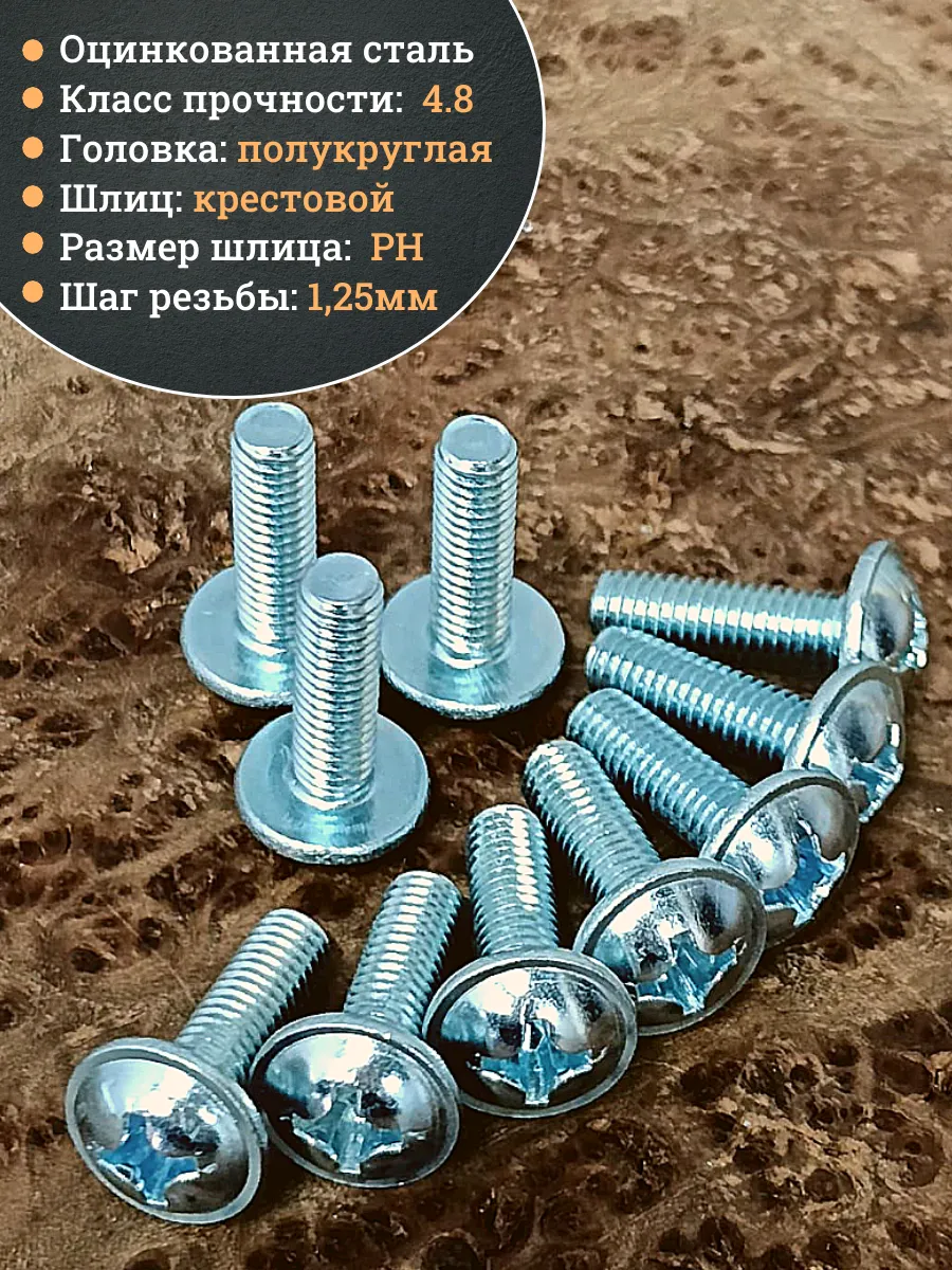 Винт мебельный с полукруглой головкой и прессшайбой, применяется при строительных работах, в машиностроении. Используется для монтажа из металла, пластика и древесины твердых пород. Монтаж производится в заранее подготовленное отверстие с применением гайки соответствующего диаметра, или применятся для вкручивания в различные резьбовые отверстия при монтаже.