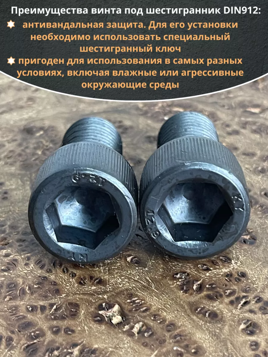 Винт имеет высокую цилиндрическую головку, предназначен для установки его с углублением в отверстие. Закручивается винт при помощи ключа-шестигранника. Высокопрочный винт DIN 912 обеспечивает надежное скрепление узлов и деталей в монтажных и других видах работ. Он имеет головку цилиндрической формы с углублением под соответствующий шестигранный ключ.
