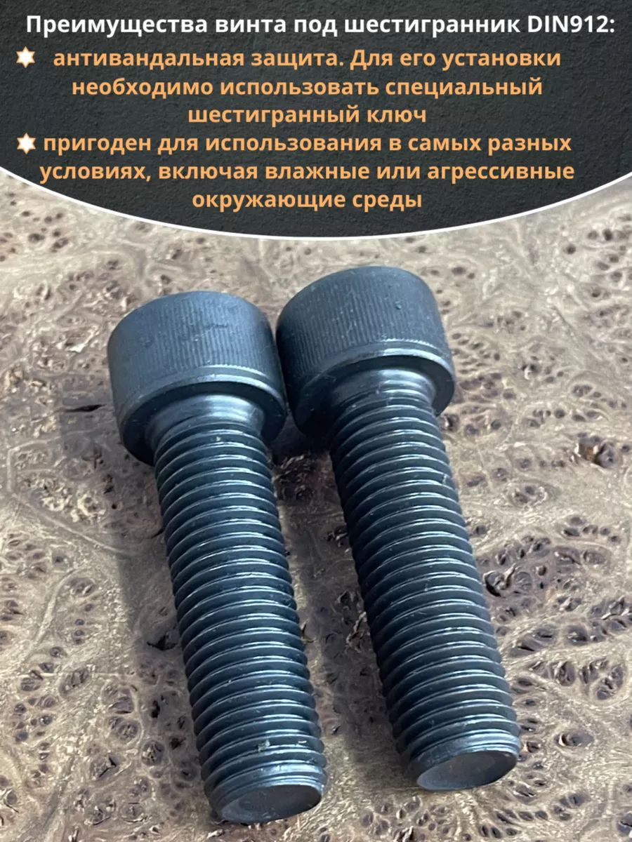 Винт имеет высокую цилиндрическую головку, предназначен для установки его с углублением в отверстие. Закручивается винт при помощи ключа-шестигранника. Высокопрочный винт DIN 912 обеспечивает надежное скрепление узлов и деталей в монтажных и других видах работ. Он имеет головку цилиндрической формы с углублением под соответствующий шестигранный ключ.