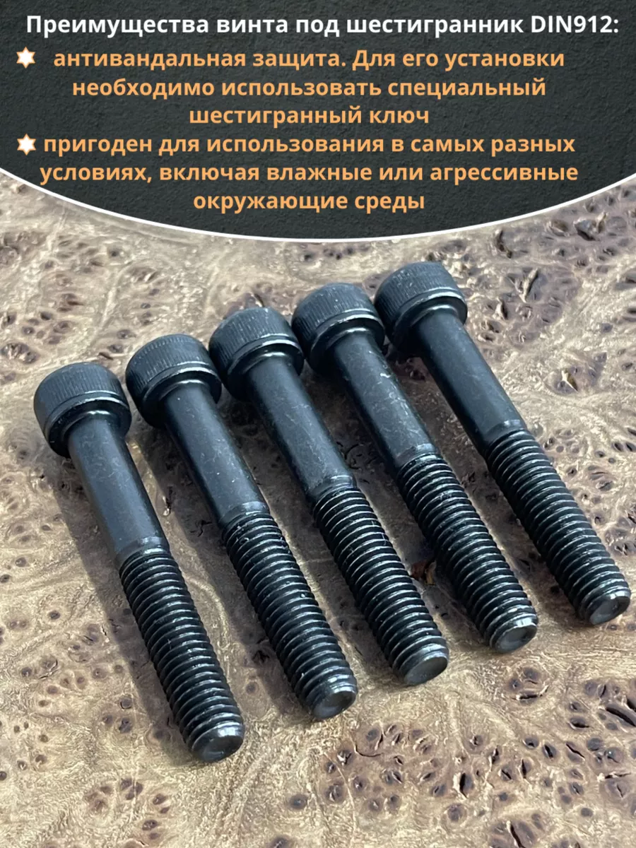 Винт имеет высокую цилиндрическую головку, предназначен для установки его с углублением в отверстие. Закручивается винт при помощи ключа-шестигранника. Высокопрочный винт DIN 912 обеспечивает надежное скрепление узлов и деталей в монтажных и других видах работ. Он имеет головку цилиндрической формы с углублением под соответствующий шестигранный ключ.