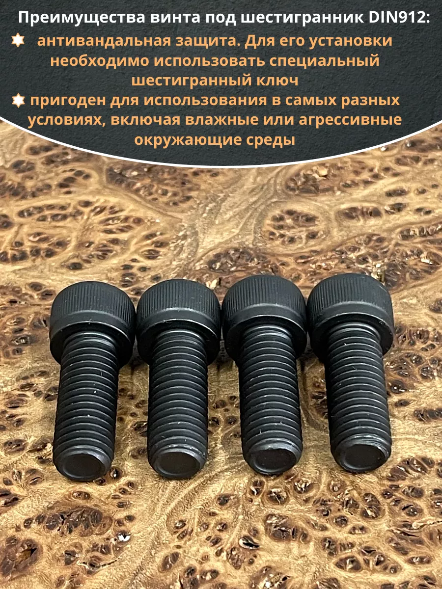 Винт имеет высокую цилиндрическую головку, предназначен для установки его с углублением в отверстие. Закручивается винт при помощи ключа-шестигранника. Высокопрочный винт DIN 912 обеспечивает надежное скрепление узлов и деталей в монтажных и других видах работ. Он имеет головку цилиндрической формы с углублением под соответствующий шестигранный ключ.