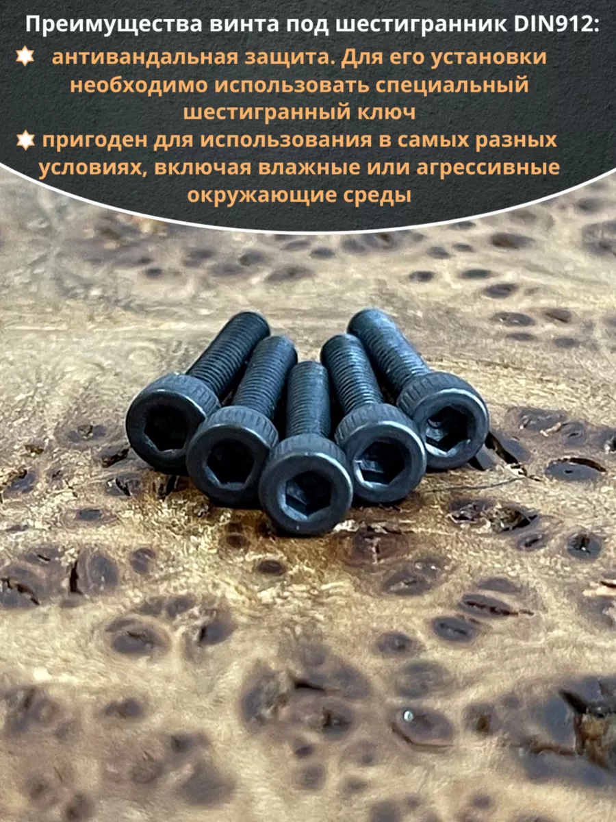 Винт имеет высокую цилиндрическую головку, предназначен для установки его с углублением в отверстие. Закручивается винт при помощи ключа-шестигранника. Высокопрочный винт DIN 912 обеспечивает надежное скрепление узлов и деталей в монтажных и других видах работ. Он имеет головку цилиндрической формы с углублением под соответствующий шестигранный ключ.