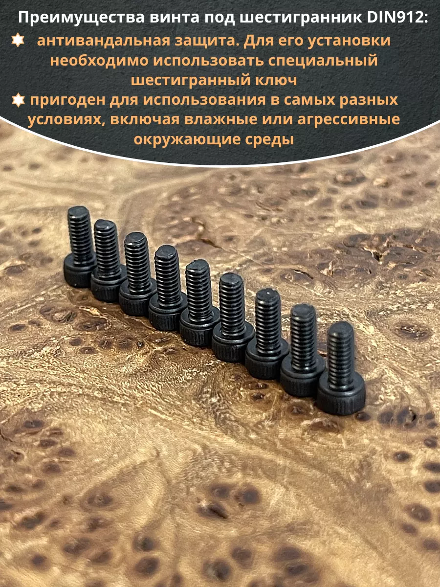 Винт имеет высокую цилиндрическую головку, предназначен для установки его с углублением в отверстие. Закручивается винт при помощи ключа-шестигранника. Высокопрочный винт DIN 912 обеспечивает надежное скрепление узлов и деталей в монтажных и других видах работ. Он имеет головку цилиндрической формы с углублением под соответствующий шестигранный ключ.