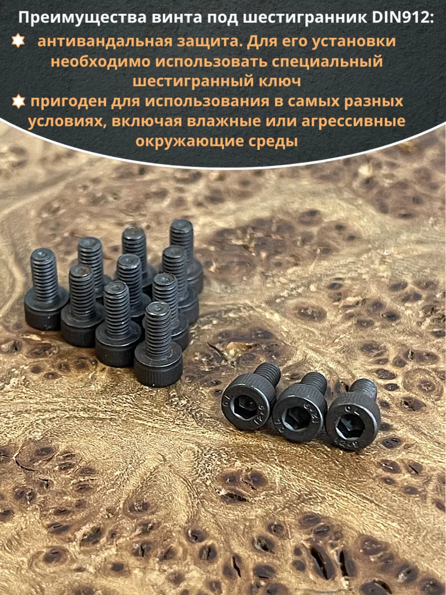 Винт имеет высокую цилиндрическую головку, предназначен для установки его с углублением в отверстие. Закручивается винт при помощи ключа-шестигранника. Высокопрочный винт DIN 912 обеспечивает надежное скрепление узлов и деталей в монтажных и других видах работ. Он имеет головку цилиндрической формы с углублением под соответствующий шестигранный ключ.