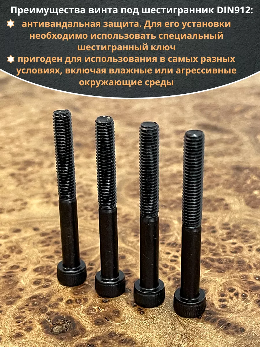 Винт имеет высокую цилиндрическую головку, предназначен для установки его с углублением в отверстие. Закручивается винт при помощи ключа-шестигранника. Высокопрочный винт DIN 912 обеспечивает надежное скрепление узлов и деталей в монтажных и других видах работ. Он имеет головку цилиндрической формы с углублением под соответствующий шестигранный ключ.
