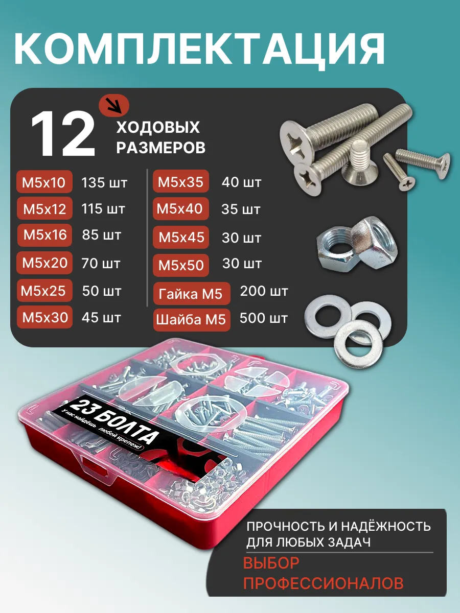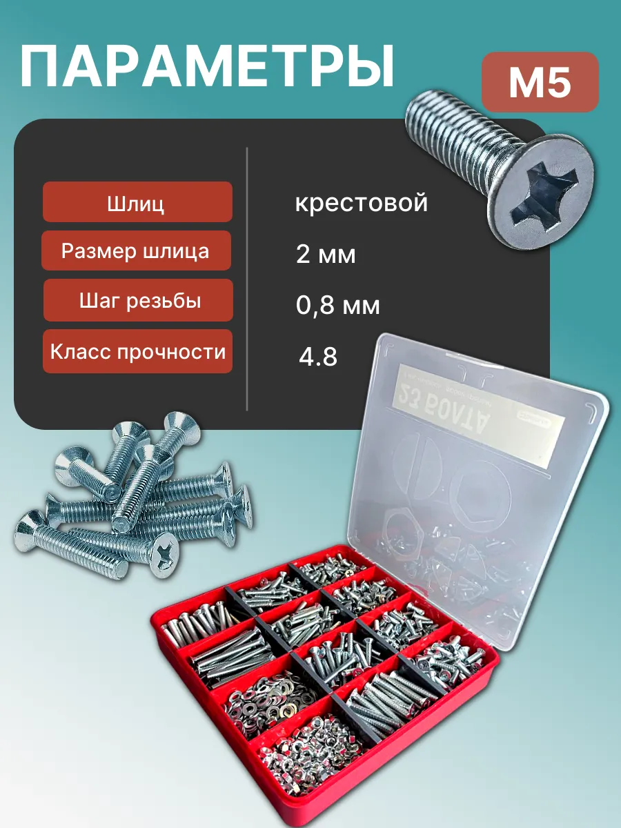 Винты потай ОЦ М5 DIN965 с гайкой,шайбой органайзер НАБОР2