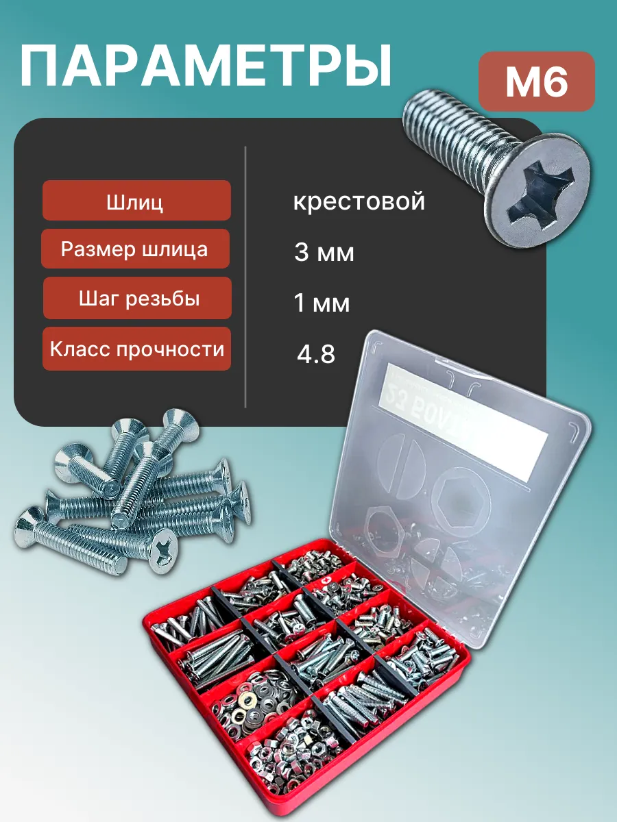 Винты потай ОЦ М6 DIN965 с гайкой,шайбой органайзер НАБОР2