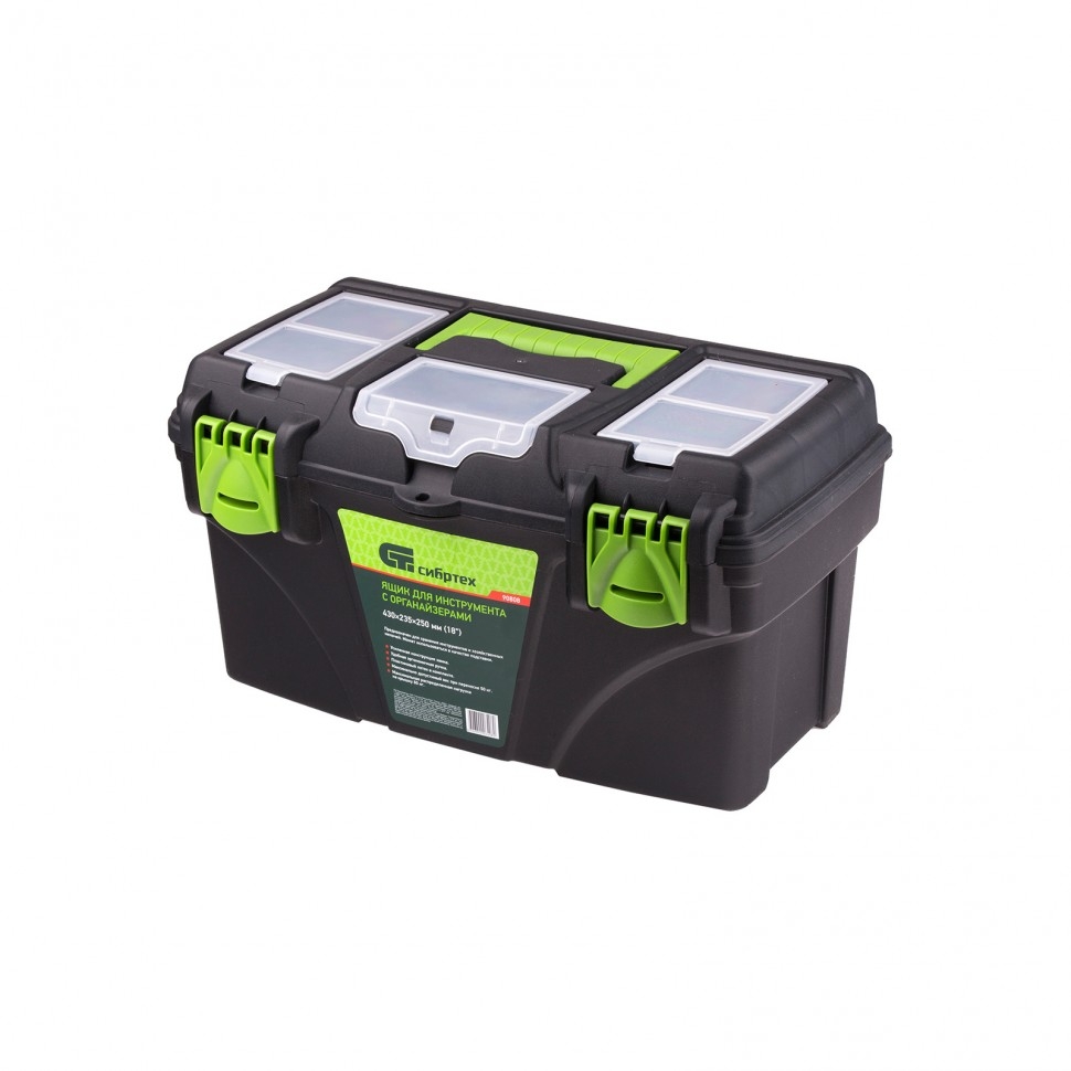 Ящик Сибртех 90808, 18 дюймов, с органайзерами, используется для хранения и транспортировки инструментов, оснастки, крепежей, хозяйственных мелочей и других предметов. Крышка и замок усилены трехрядными петлями, поэтому он выдерживает вес содержимого до 50 кг. Ящик можно брать в поездку, также он пригодится дома, на даче или в гараже. В крышке предусмотрены органайзеры, в которых можно рассортировать крепежи и другие мелкие детали.